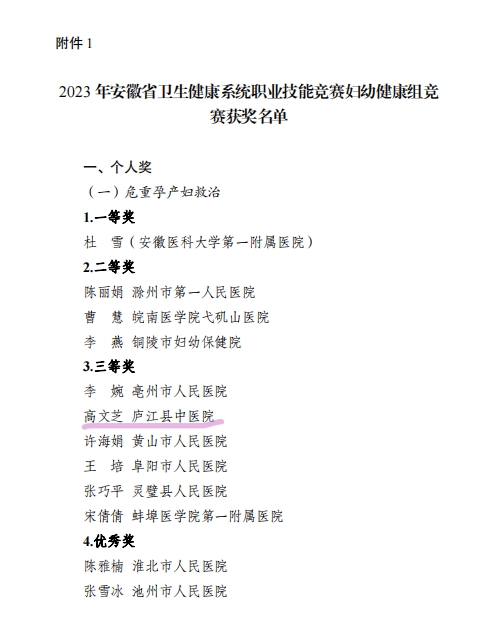 近日,我院妇产科副主任医师高文芝以全市“危重孕产妇救治”竞赛第一的优异成绩,代表合肥市参加安徽省卫生健康系统职业技能竞赛决赛。